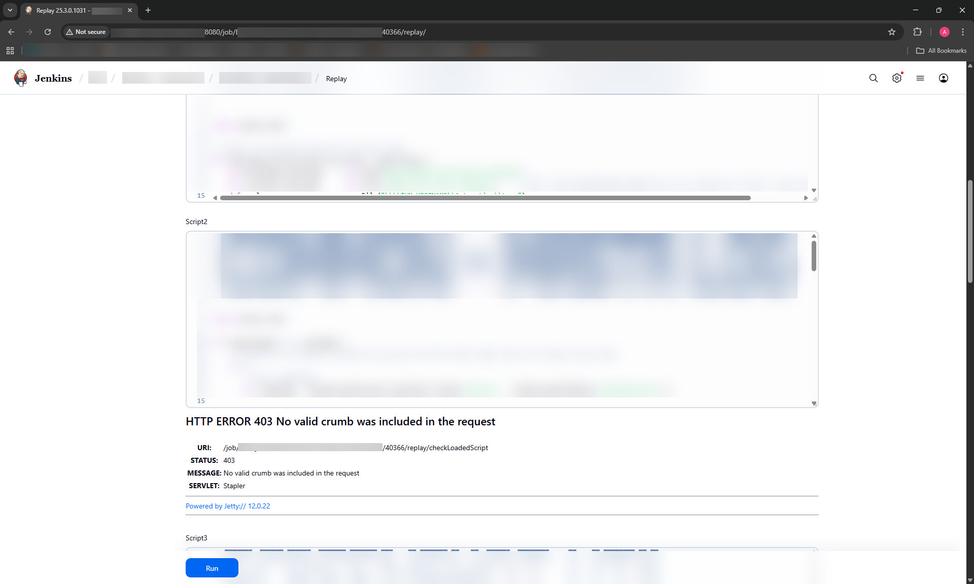 Occurs on numerous pages within Jenkins when trying to run/re-run jobs